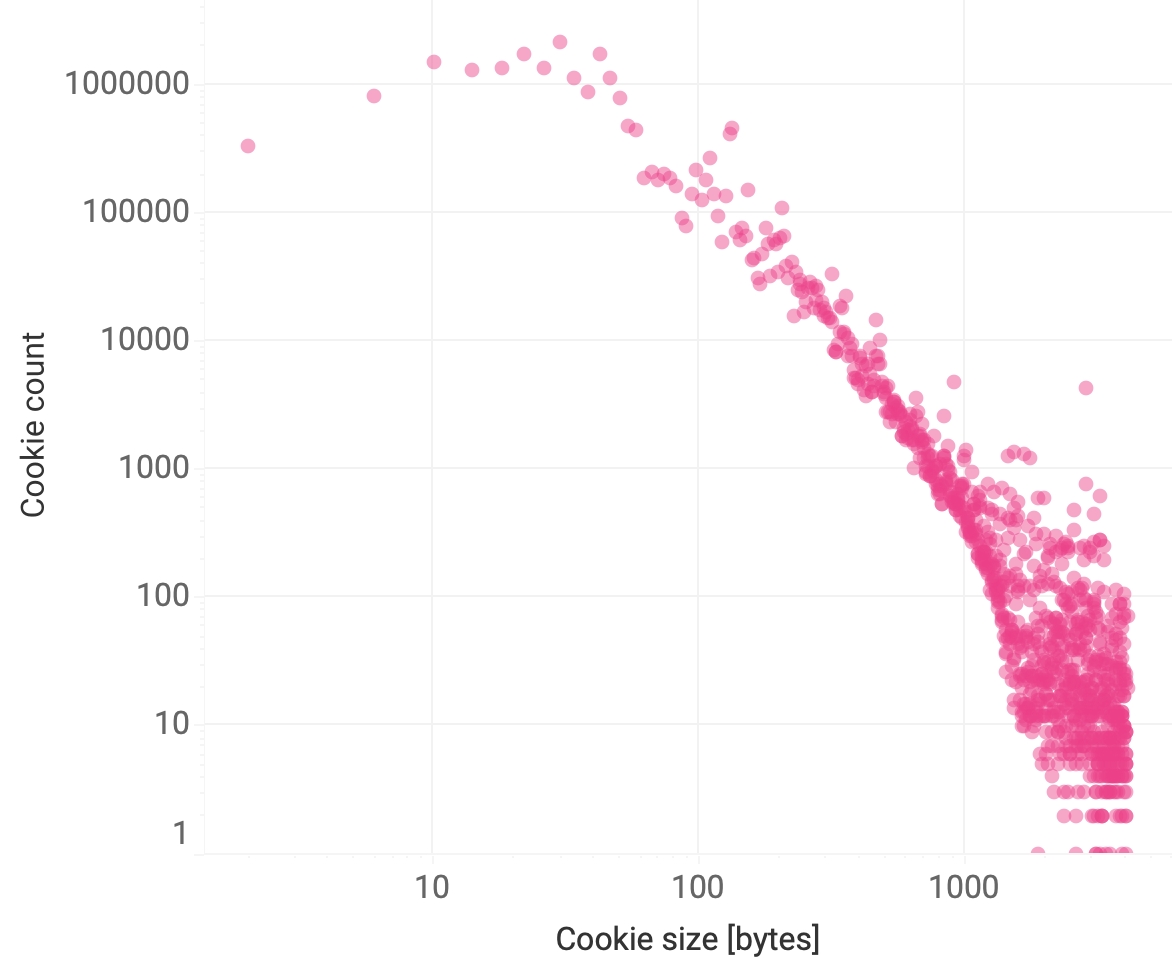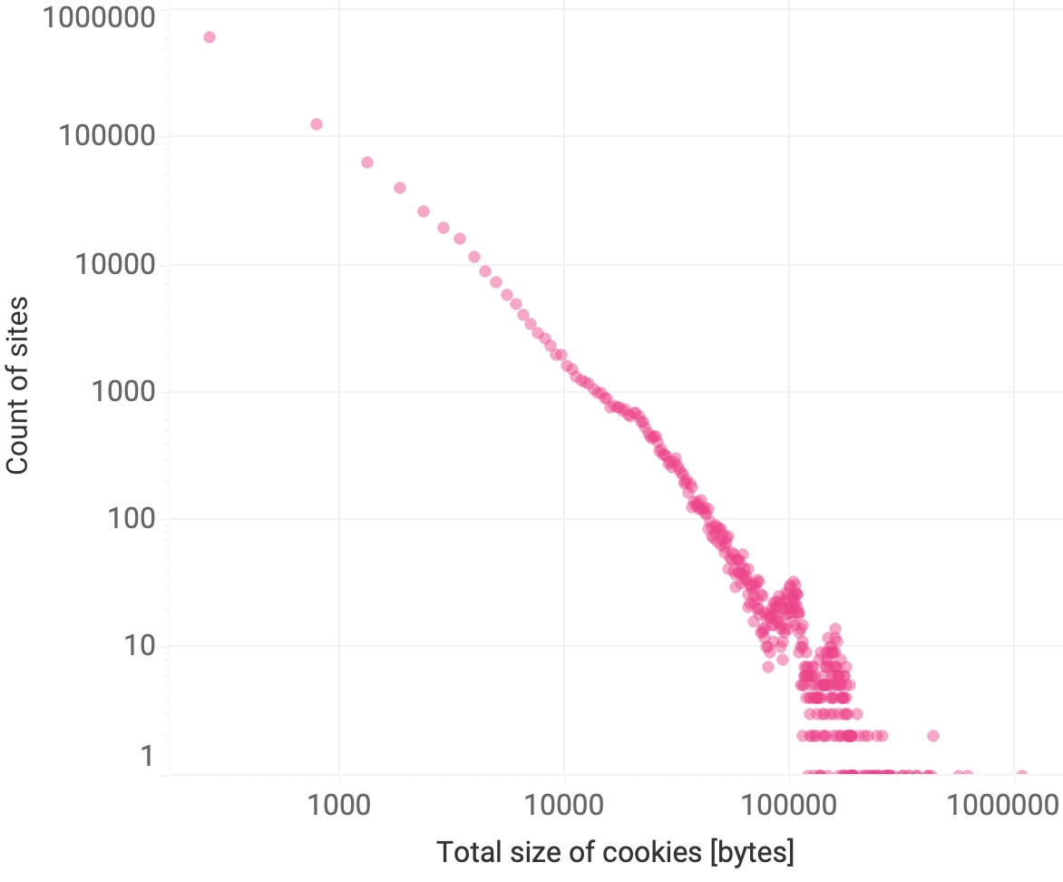 Figure 10. Histogram of the accumulated size of all cookies found in the crawled websites. Notice that many sites have several kB of cookies. The site count decays with a power close to 2.