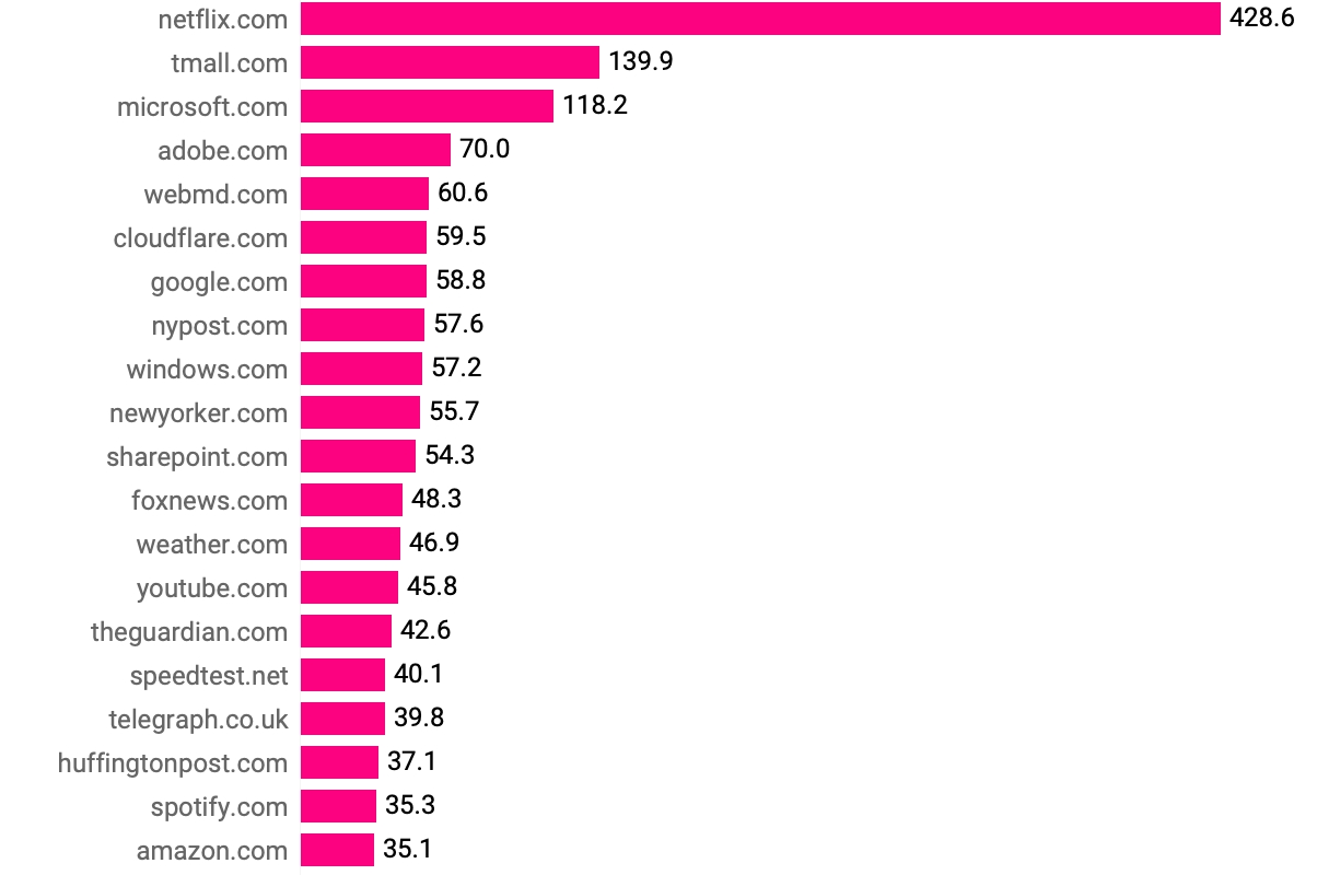 The top site in our ranking is netflix.com, followed by tmall.com and microsoft.com. It is interesting that some sites should be aggregated, as they are simple variations of the original domain for different countries or for capturing typos or products of the same brand. However, we currently have no method of grouping them together consistently. The top 20 sites by emission from cookies are shown in Figure 11.