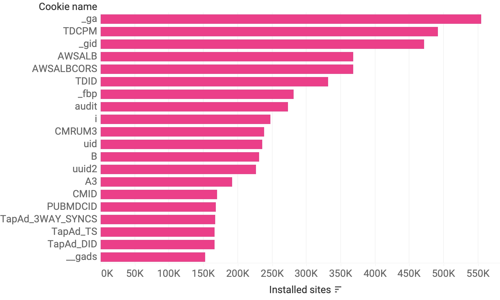 [4] The most installed cookie in our sample list is _ga (Google Analytics), found on over 534 thousand sites.