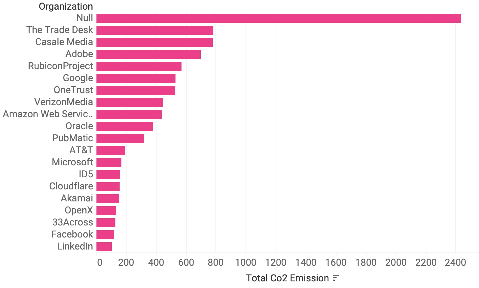Figure 16. Top 20 organizations by CO2 emissions of their cookies. Null stands for the cookies that we weren’t able to assign to any organization.
