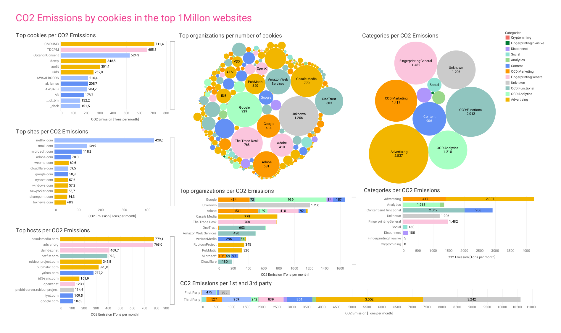 The research behind Carbolytics identifies and analyses the carbon emissions of the total number of cookies belonging to the top one million websites. The investigation identified more than 21 million cookies per single visit to all these websites, belonging to more than 1200 different companies, which translates to an average of 197 trillion cookies per month, resulting in 11,442 monthly metric tonnes of CO2 emissions. This number reflects only browser-based cookie traffic and does not include other behavioural advertising tools, such as app tracking activity or profiling algorithms, so we estimate the actual number of emissions by tracking technologies to be dramatically higher.