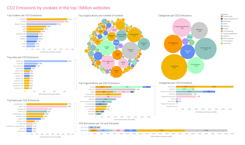In all the statistics aggregated by cookie or by cookie host, organization or category, we only included the data from the sites we measured directly. However, in estimating the overall emissions from the top one million most visited sites, we chose to also include the estimated size of the cookies (and their emissions) that we would find in the sites we could not measure – even if this added uncertainty to our estimates.