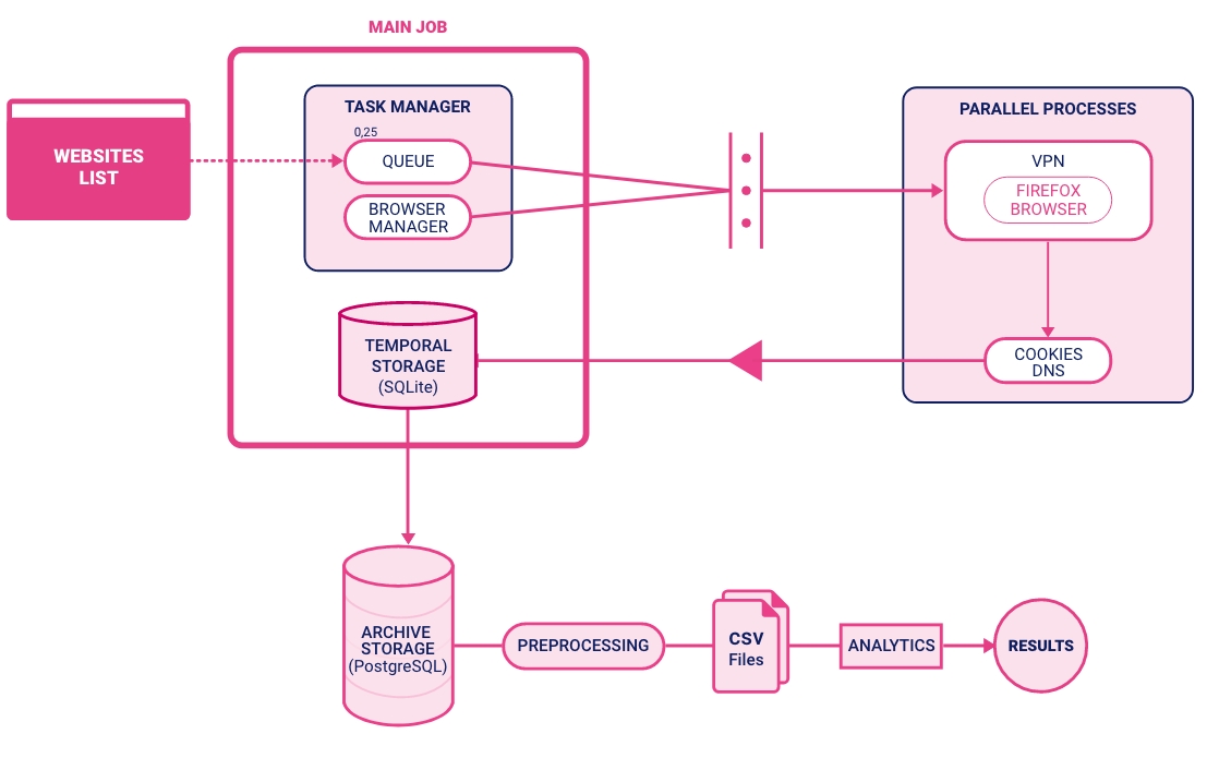 [17] web privacy measurement tool based on Mozilla Firefox, and Selenium, automation software that supports parallelism for speed and scale, as well as a comprehensive browser instrumentation. Under the GDPR online data privacy rules, users browsing from inside the Economic European Area must consent to the use of cookies on each site, which usually involves a modal window of some form where the user can click the “accept” button after configuring their preferences.
