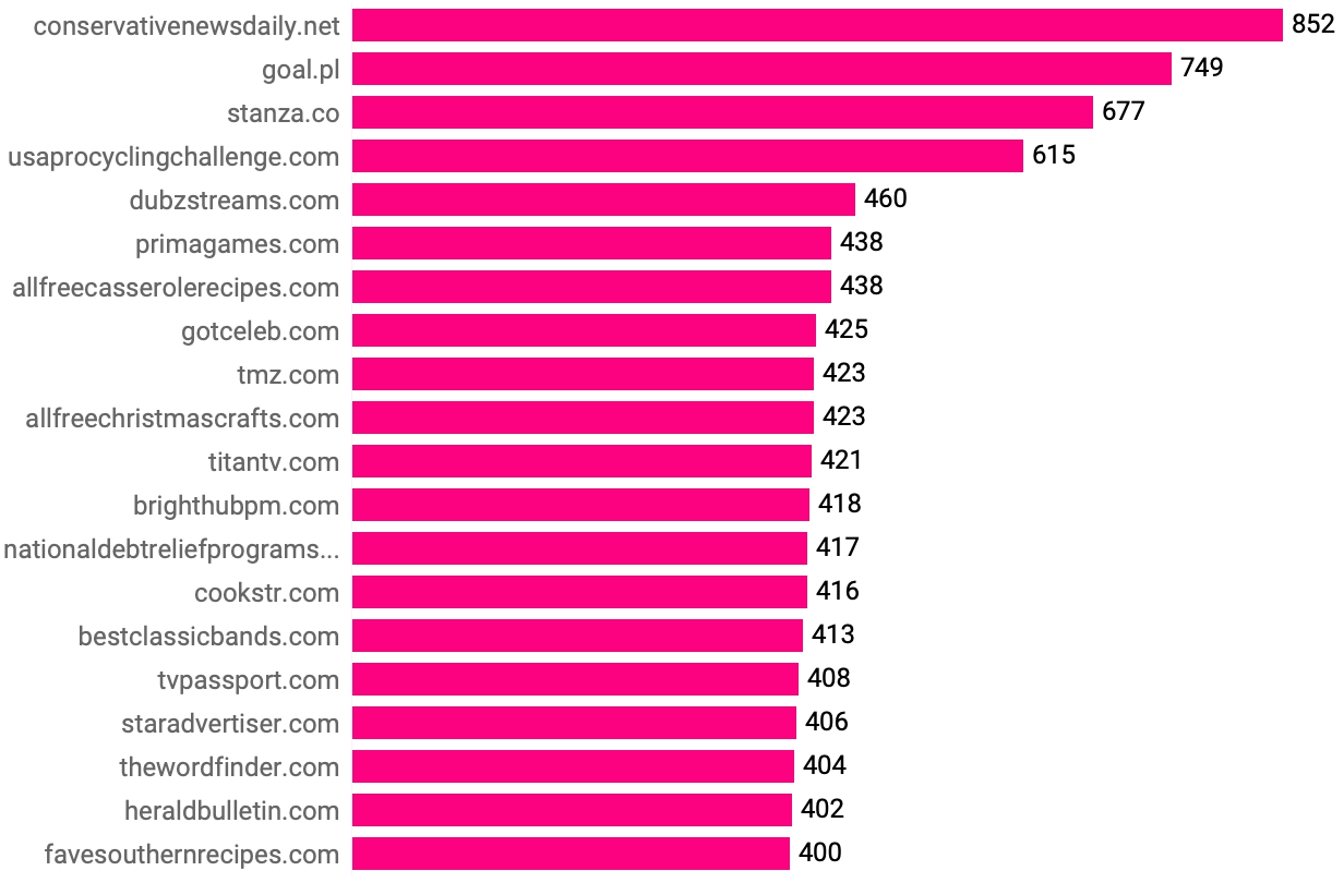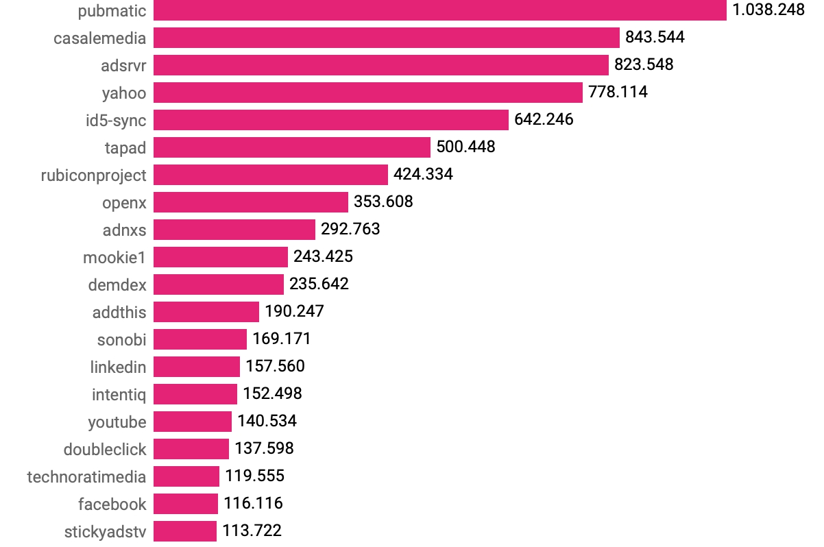 Many tracking cookies are used across different sites, but they are easily identifiable because they are served from the same host and have the same name. A coincidence of those two ensures that the cookie is unique and we can count the sites where it is installed. With this grouping, we obtain a ranking of cookies by the number of sites they can be found on (see Figure 12).