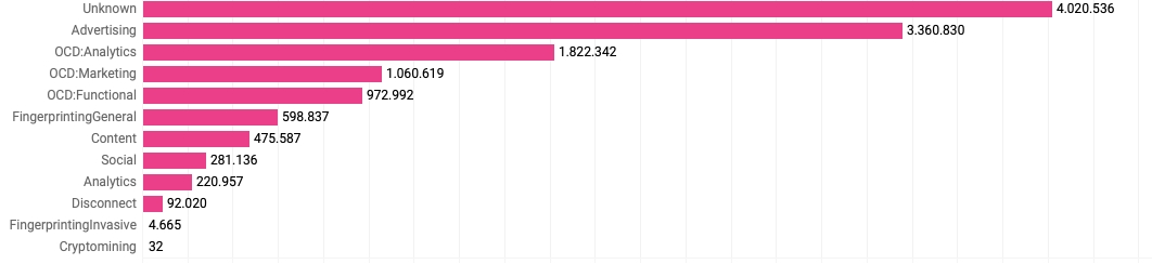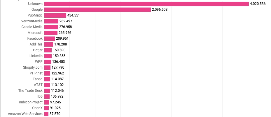The cookies we found came from 908,358 different hosts (Figure 15), and were able to assign the cookies to over 1200 organizations (Figure 16). Of the top five hosts responsible for emissions (Casale Media, adsrvr.org by The Trade Desk, demdex.net by Adobe, Netflix and the Rubicon Project – now Magnite), only one, i.e. Netflix, is not an online advertising company. This reading could be biased because the sources we used to identify organizations have a vested interest in identifying mainly online tracking companies.