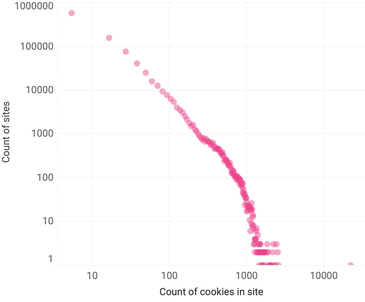 [5] The first thousand cookies (the top 0.018%), by the number of sites they are installed on, cause a stunning 50% of all the emissions, and the top 1% of cookies (a little over 53 thousand) corresponds to 82% of emissions.